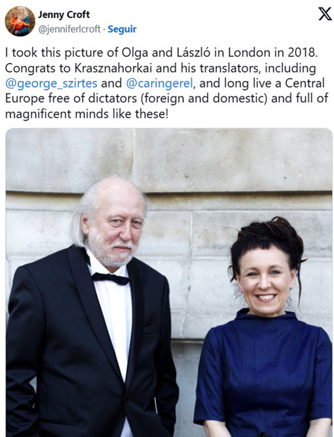 La traductora y escritora estadounidense Jennifer Croft posteó en X una foto tomada en 2018 de Krasznahorkai junto con la Nobel Olga Tokarczuk (cuya obra Croft tradujo al inglés) con la frase “larga vida a Europa Central libre de dictadores (extranjeros y domésticos) y colmada de mentes magníficas como las de ellos”.