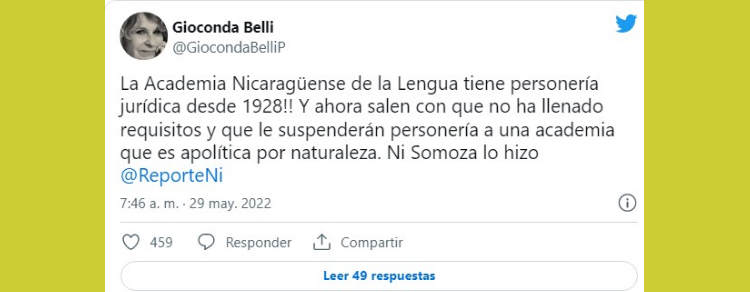La institución fue fundada en Managua, en 1928, por siete intelectuales, liderados por el político y jurista Carlos Cuadra Pasos, que la instalaron en el salón de honor del Ministerio de Relaciones Exteriores. Una de sus motivaciones es el diálogo entre dos culturas, por eso su escudo representa el encuentro entre el conquistador Gil González Dávila y un jefe guerrero del Nuevo Mundo, que podría haber sucedido en 1523, cuando los españoles arribaron a aquellas tierras. Lo acompaña un verso de Rubén Darío: “En espíritu unidos, en espíritu y ansias y lengua”. Entre los académicos actuales se encuentran escritores como Sergio Ramírez, exiliado en España tras una orden de detención emitida por el mismo Gobierno, o la poeta y novelista Gioconda Belli, también opositora del régimen. Precisamente, Belli publicó el domingo un tuit con el siguiente mensaje: “La Academia Nicaragüense de la Lengua tiene personería jurídica desde 1928!! Y ahora salen con que no ha llenado requisitos y que le suspenderán personería a una academia que es apolítica por naturaleza. Ni Somoza [por el dictador nicaragüense] lo hizo”.